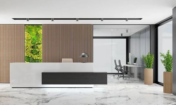 前台的色彩不能太单一或过于繁杂,要与大堂统一在一个色调中,同时通过改变材料材质、增加布艺靠垫等进行调节,再对艺术品的颜色重点处理,以产生比较理想的效果。