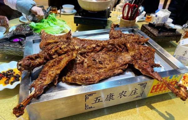 没一会儿,香喷喷的烤全羊在我们的期盼下上桌了,简单的“山羊开泰”揭盘仪式过后,一瞬间芳香四溢。