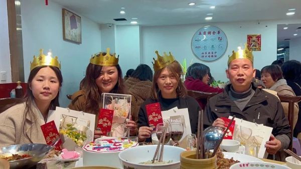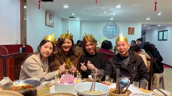 同事们暂时放下筷子,纷纷忙活起来,为我们的寿星们带上皇冠,插上蜡烛,