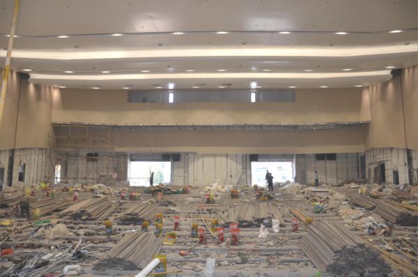 首先,项目组一行以一楼的中庭花园为中心,视察了位于一楼的培训教室、演播厅、大礼堂、多功能厅等,主要就内部结构的工艺要求、技术规范等进行了检查,并与施工团队沟通了一些细节问题,提供了修改和调整的意见。
