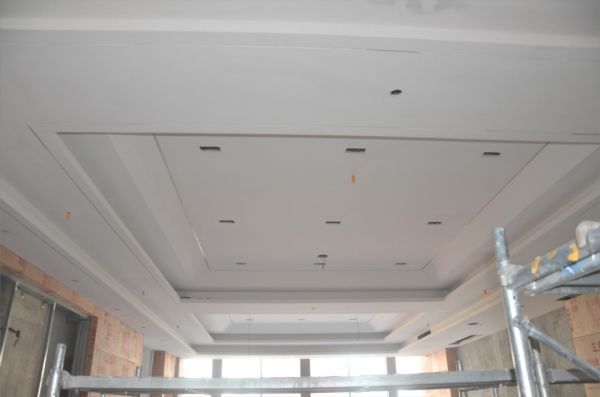 随后,项目组一行视察了中间楼层的不同规模、功能各异的会议室、包厢、接待室等,着重检查了现场施工队在实际施工时是否存在与图纸不符的情况,以及灯线预留和吊挂点预埋的问题等。