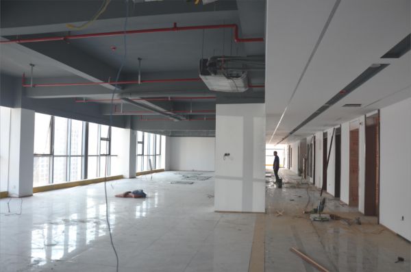 目前总部大楼的室内装修工作正在如火如荼地进行中,地砖铺设、墙面材料铺贴、天花吊顶施工、水电管道安装等工作已陆续完成,根据现场施工队提供的施工进度计划表来看,项目预计将在10月底完成收尾工作。