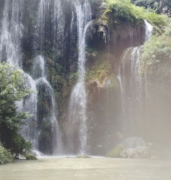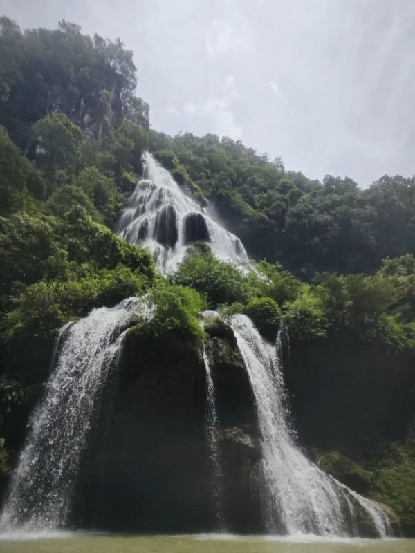 沿着溪流,我们途径了浑然天成的玉带瀑布,抵达九龙溪源头——流沙瀑布,此时的流沙瀑布,虽不似丰水期般波涛汹涌,但远观如白纱飘荡,又如白色细沙慢慢漏下,像沙漏记录着这千年苗寨的万古风情。