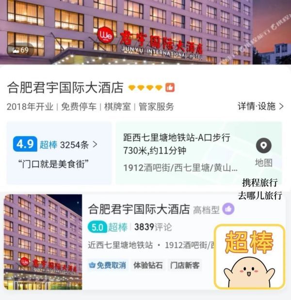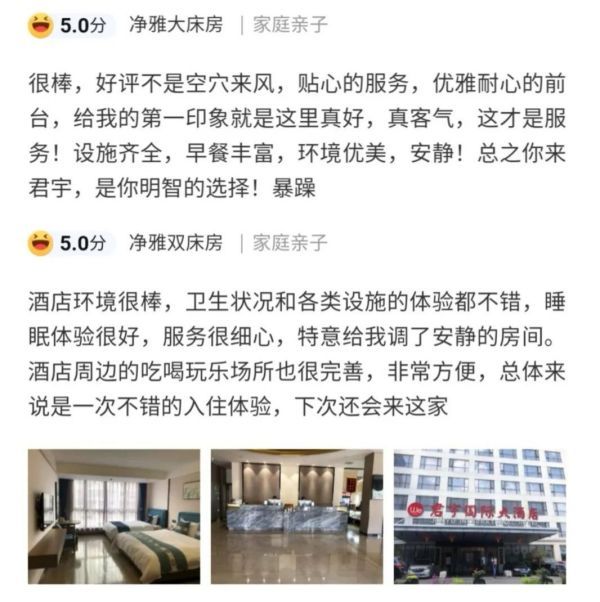 酒店自开业以来,生意一直很红火,在竞争圈和客人好评方面,每年保持当地前列,在OTA平台上可以清晰地了解到君宇酒店的经营状况,评分高达4.9,高出同类99%的酒店。