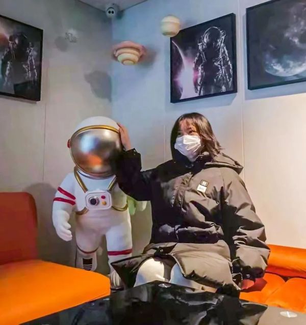 吧台上的机器人模型憨态可掬的样子好可爱,电梯厅的太空宇航员模型尤其吸引孩子们的注意,于是,拍照留念是少不了的。