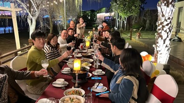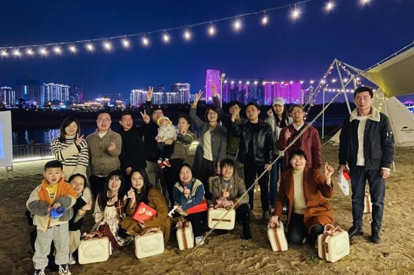 酒足饭饱之后,以流光溢彩的江景为背景,全体员工留下了大合影,还纷纷拿出手机取景拍照、分享给亲友。