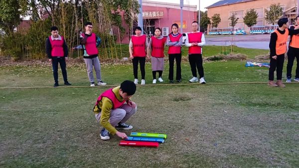 教练在地面三根竹管上反扣着两组从A至K的13张打乱顺序的扑克牌,队员们站在5米外,需要按照规则将牌全部从A至K依次翻出来,看哪个队用时更短即为胜方。队员们有的抓耳挠腮,有的比比划划,思考着、讨论着如何破解密码。两个队发扬团队合作精神,通过分析和沟通,终于找到了解决问题的方法。