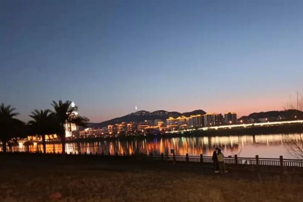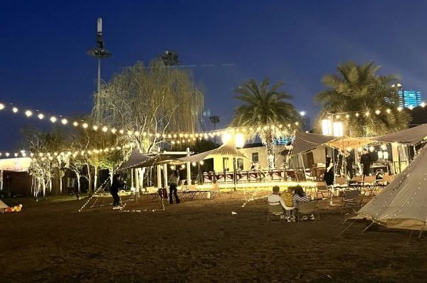 夜幕降临了,湘江对岸高楼上的璀璨彩灯辉映了江面,沙滩营地也被炫彩的灯饰装点一新。
