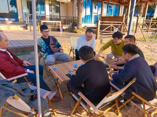 下午5点过,开展团建活动。营地教练把大家分成两个队,进行队列训练和扑克牌“密码传送”PK游戏。两个队各自取了“冰墩墩”和“雪容融”的队名,高喊口号,摆出另类造型。