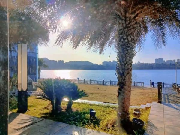 公园三面环水,湘江江面开阔,水清如镜,微风拂过,阳光下泛起层层涟漪。